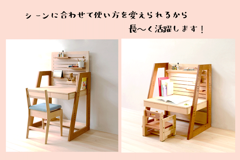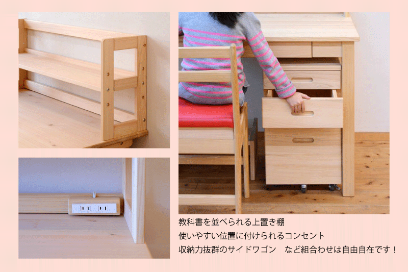 デスク本体と天板はヒノキ材で子どもにやさしい手触り。神社仏閣を建立する際にも使われるヒノキは抗菌・抗ウイルス性の高さでも有名です。 リフレッシュ効果 のあるヒノキの香りにも癒されます。